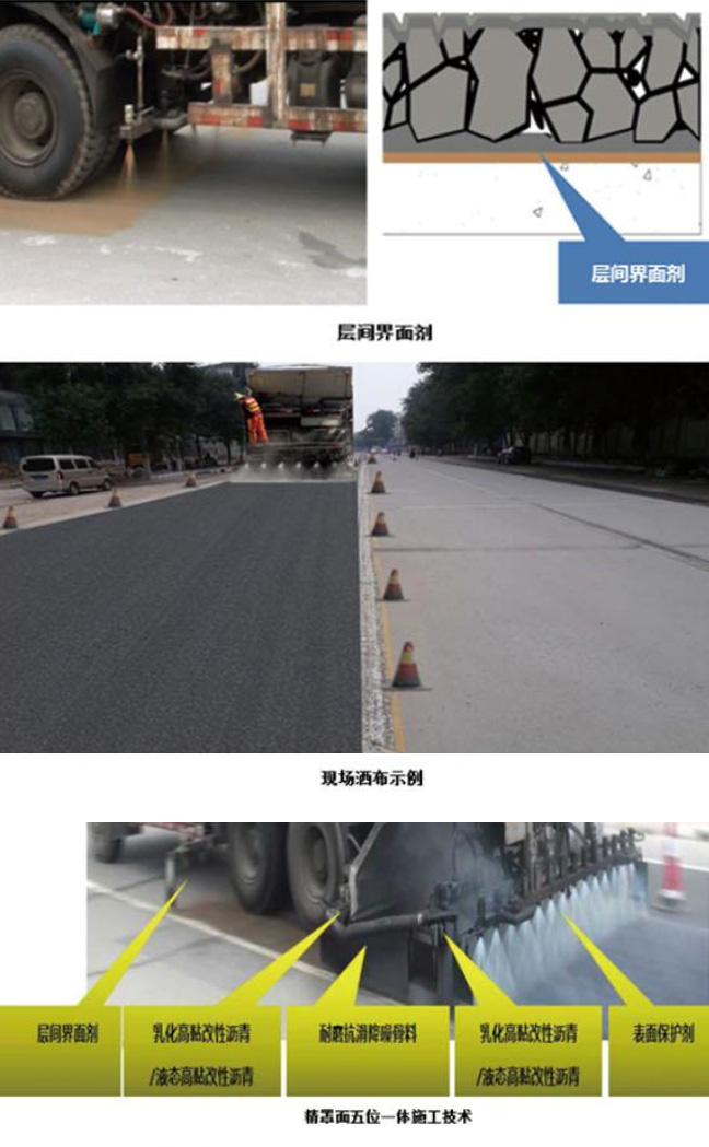 依據(jù)界面化學(xué)原理所開發(fā),含有表面活性劑、高分子粘結(jié)劑和瀝青再生劑或水泥增強(qiáng)劑等材料,層間界面劑分瀝青路面專用和水泥路面專用。增強(qiáng)對(duì)原路面層間界面劑的滲透,再生老化瀝青、激活老化瀝青的粘彈性或補(bǔ)強(qiáng)水泥,提高層間粘結(jié)力,25°C拉拔試驗(yàn)粘結(jié)強(qiáng)度≥1.0MPa,能夠防止片狀脫落,促進(jìn)新養(yǎng)護(hù)層更好的與基層結(jié)合,同時(shí)能將粉化的路面及其粉塵進(jìn)行有效裹覆,從而提高新養(yǎng)護(hù)層與基面的粘結(jié)能力。